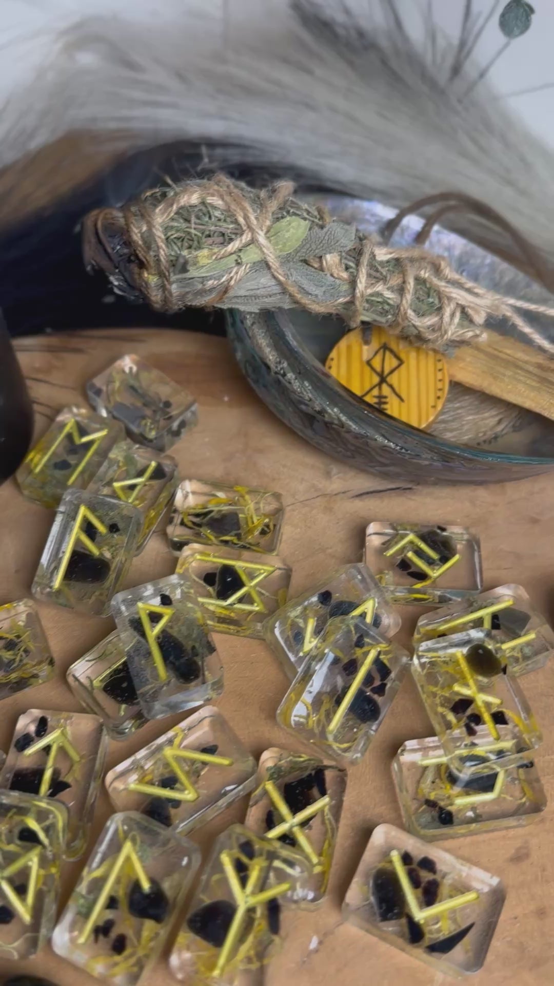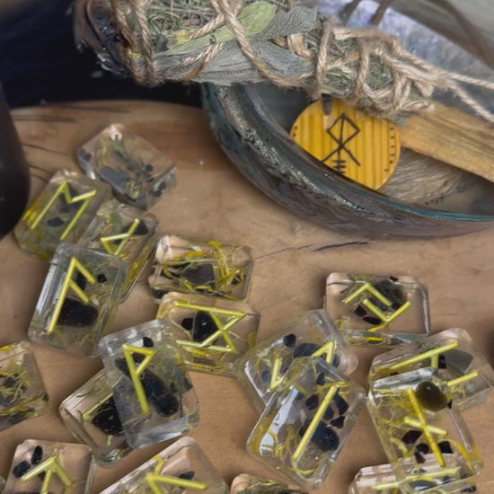🔮 Handgefertigte Runensteine aus Epoxidharz mit Obsidian & magischen Kräutern – im edlen Aufbewahrungsbeutel 🔮