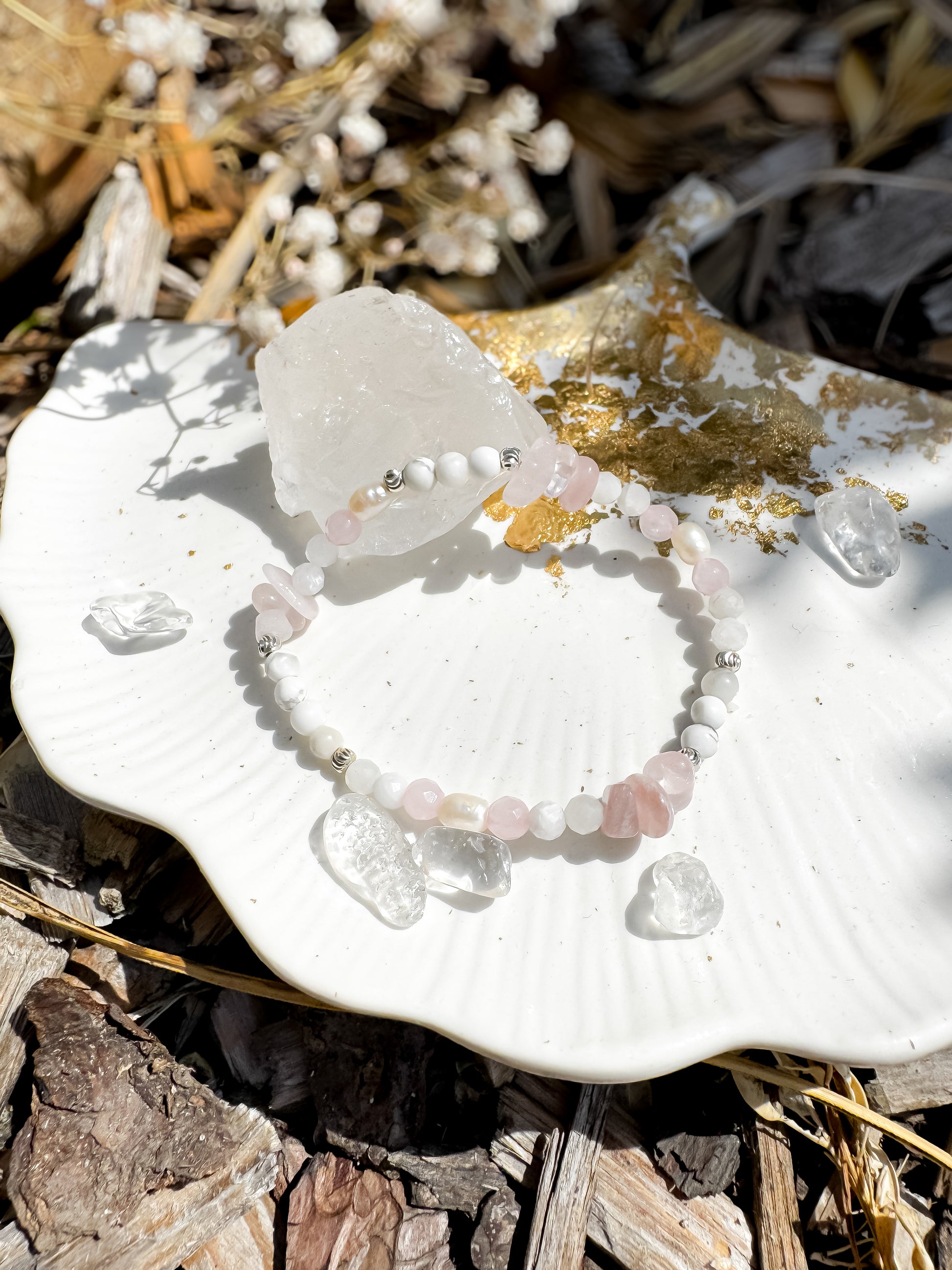 Die sanfte Kombination aus Rosenquarz, Howlith, Mondstein, echten Süßwasserperlen und zarten 925er Silber-Zierperlen bringt die Energie von Selbstliebe, innerer Klarheit und weiblicher Intuition an dein Handgelenk.