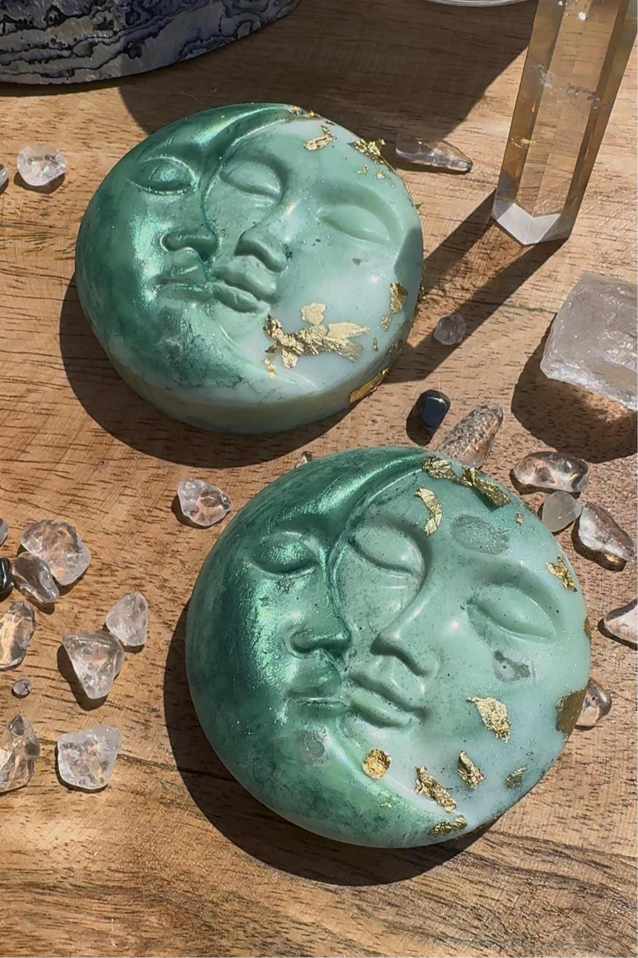 Moonlight wurde bei Vollmond gegossen und enthält kleine reine Bergkristalle, der für energetische Reinigung, geistige Klarheit und Fokussierung steht.