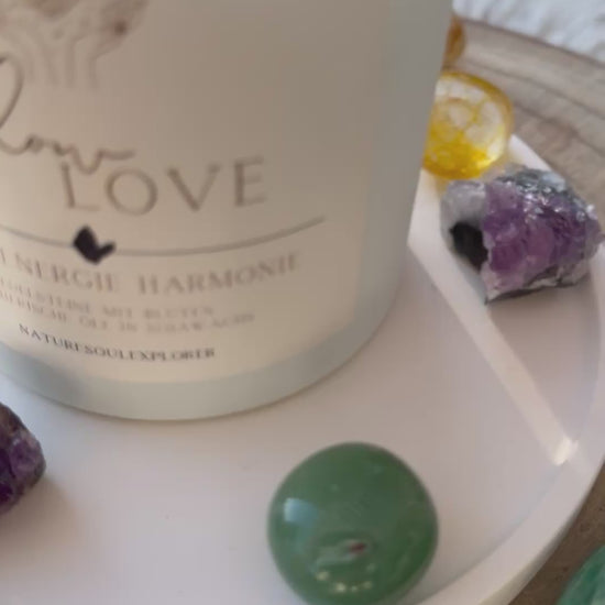 Handgegossen aus reinem Sojawachs, ätherischen Ölen, Duftöle & Blüten mit der Energie von Liebe und Achtsamkeit aufgeladen.