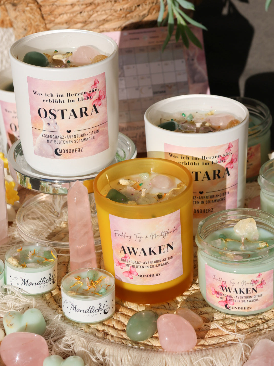 Kristallkerze AWAKEN Frühling Tag&Nachtgleiche mit Rosenquarz, Aventurin&Citrin