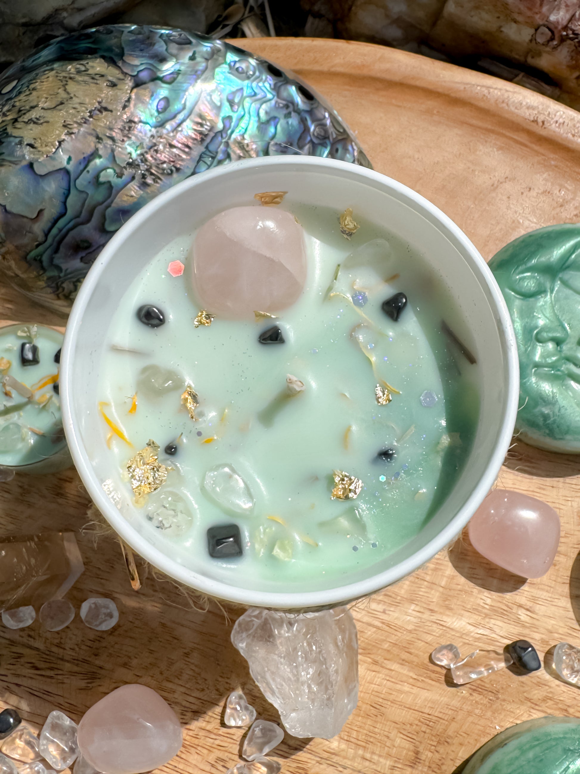 Mit echtem Rosenquarz, Hämatit und Bergkristall eingebettet in sanfte Blüten, Blattgold und fein geschnittenes Palo Santo-Holz. Mit ätherischen Ölen & Duftölen.