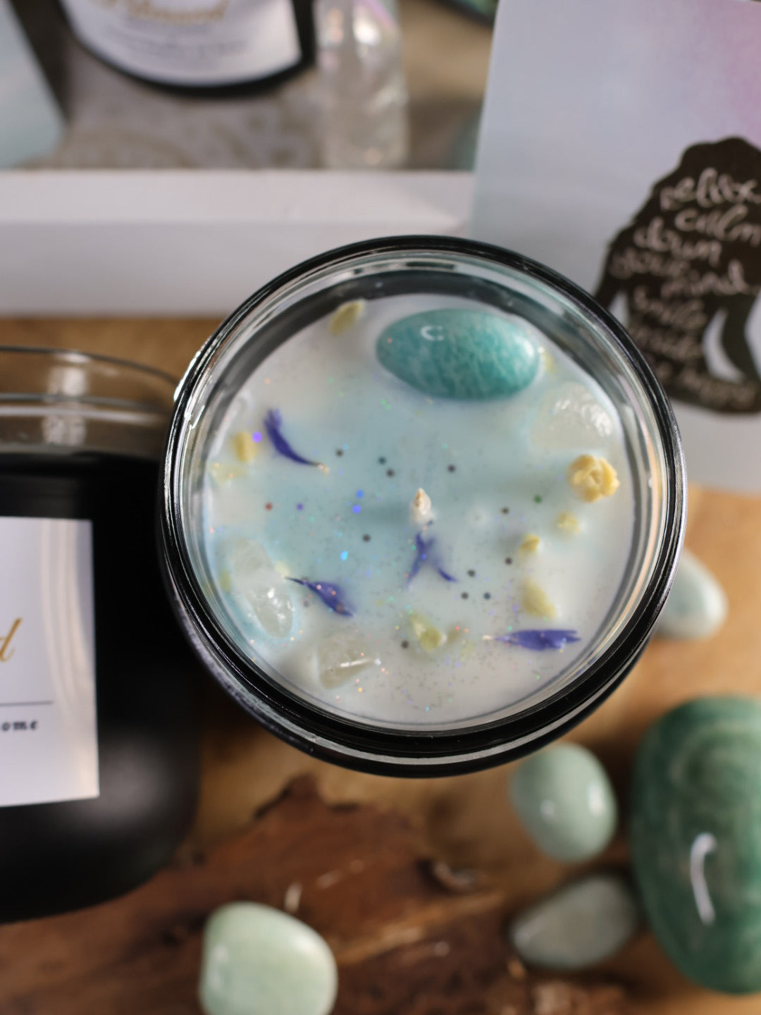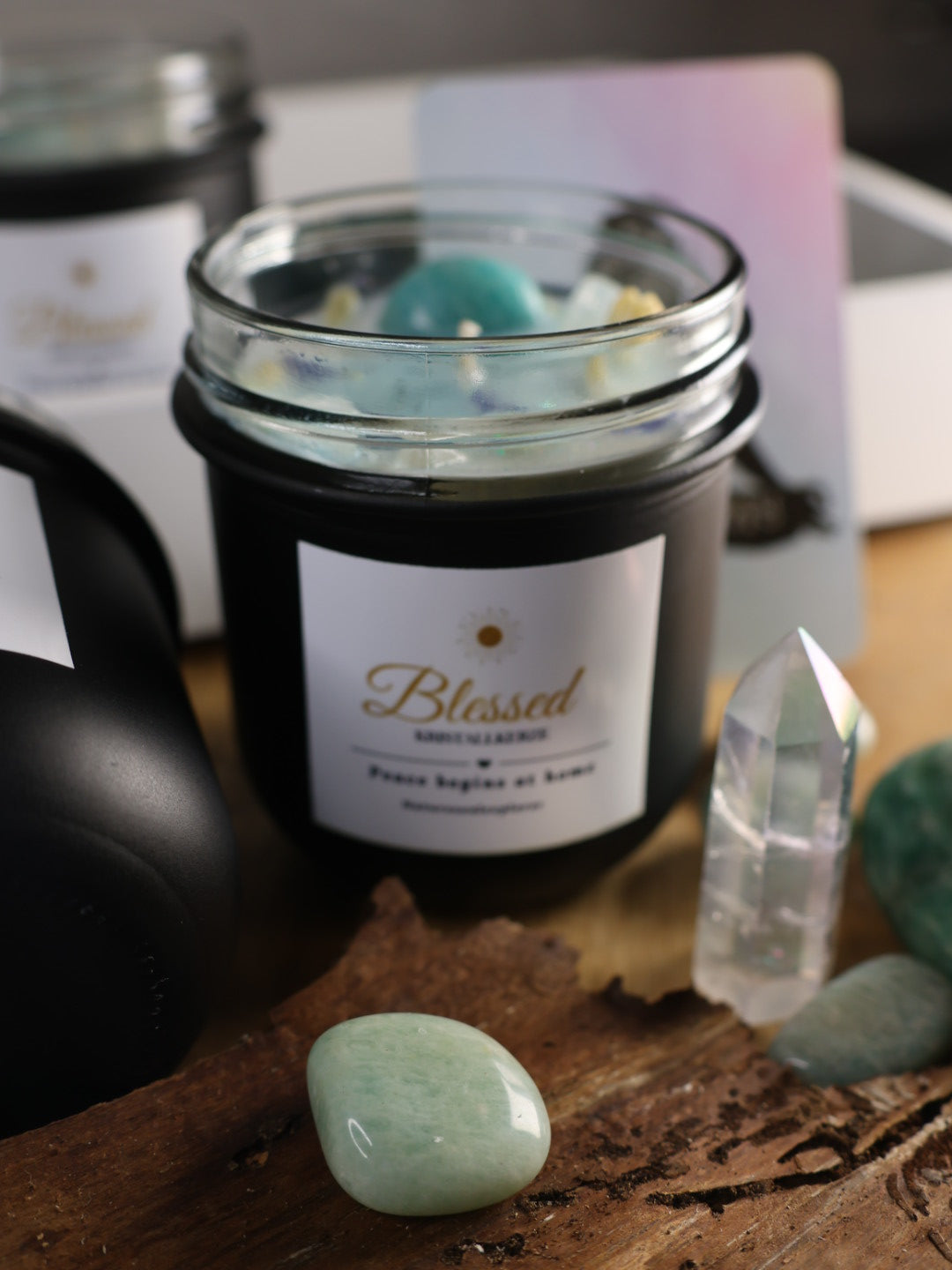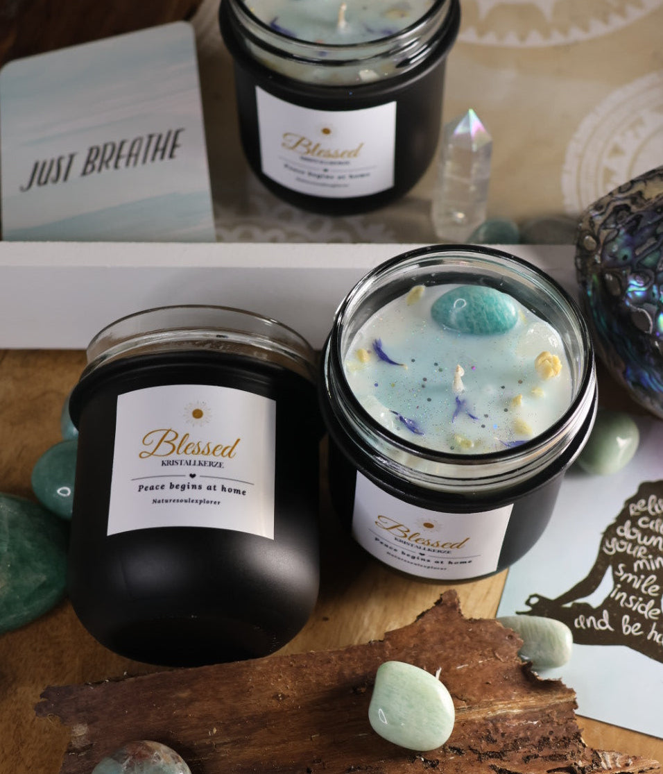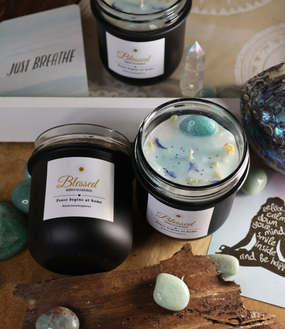 Kristallkerze „Blessed“ vereint die sanfte Kraft des Amazonits, der das Herz beruhigt und für Harmonie sorgt, mit der klaren Energie des Bergkristalls, der Reinheit und Bewusstsein stärkt.