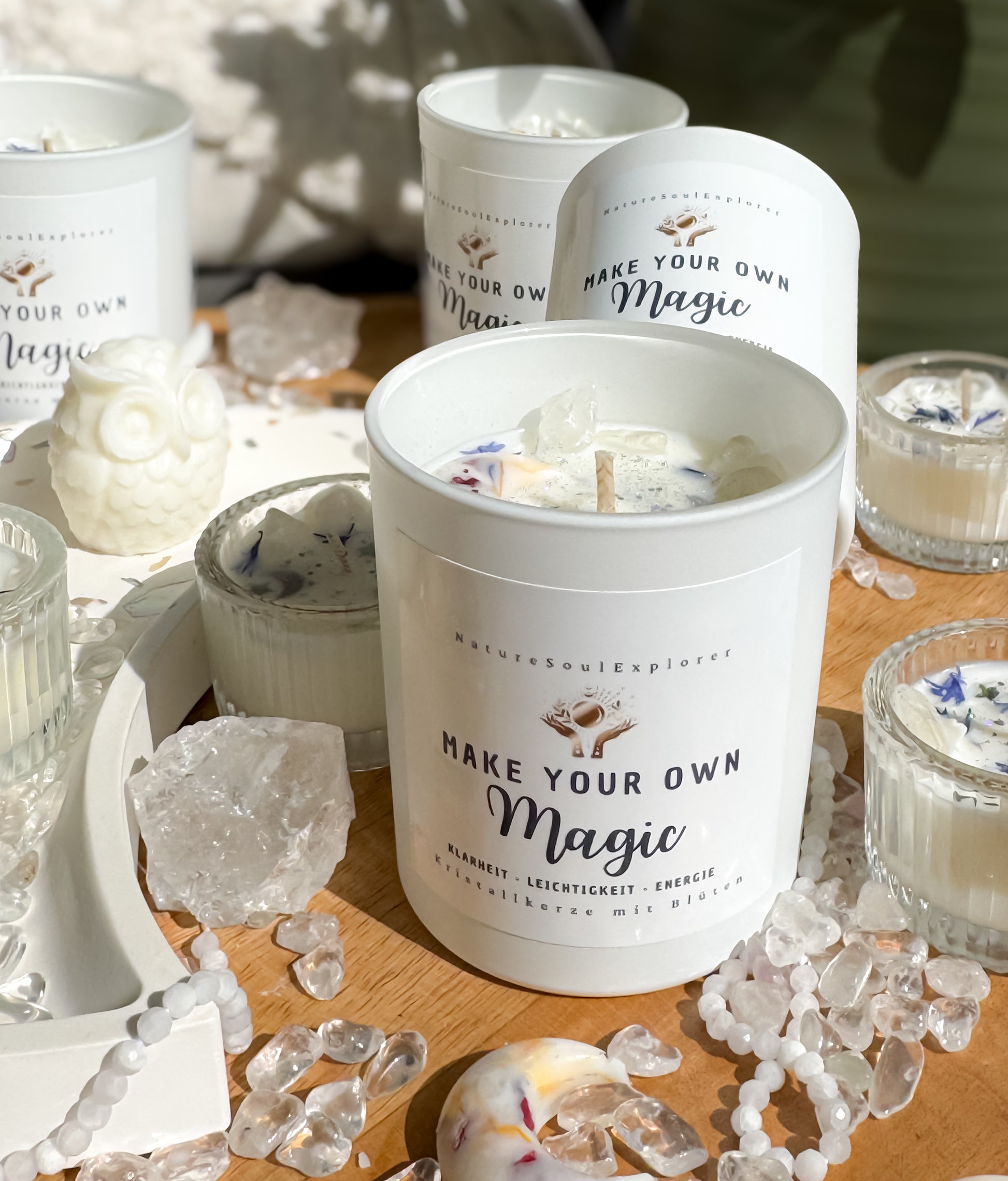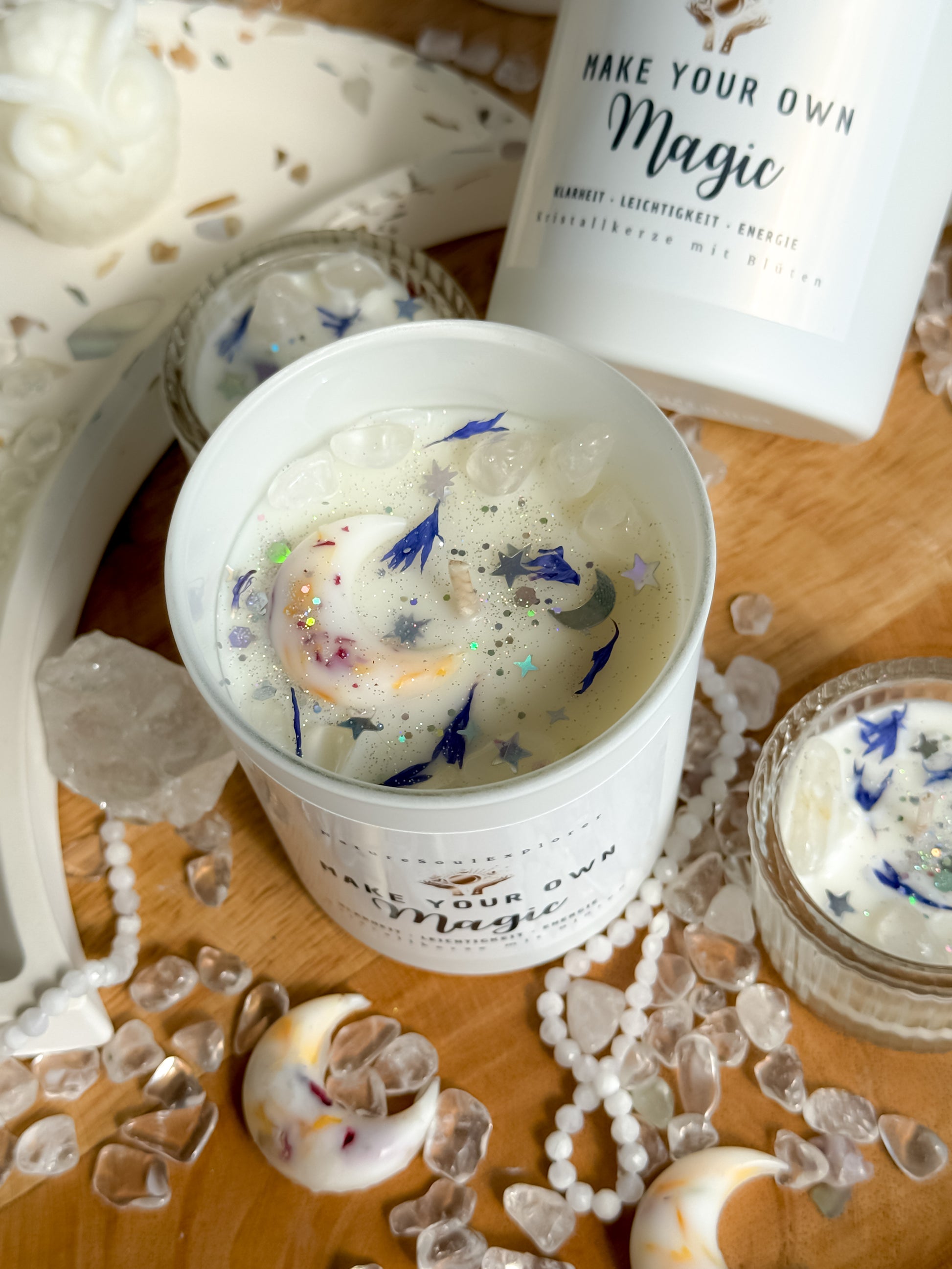 Make Your Own Magic wurde mit Liebe und Achtsamkeit handgegossen – begleitet von echten Blüten, kraftvollem Bergkristall und einer Komposition aus hochwertigen, ätherischen und duftenden Ölen in 100 % reinem Sojswachs gegossen.