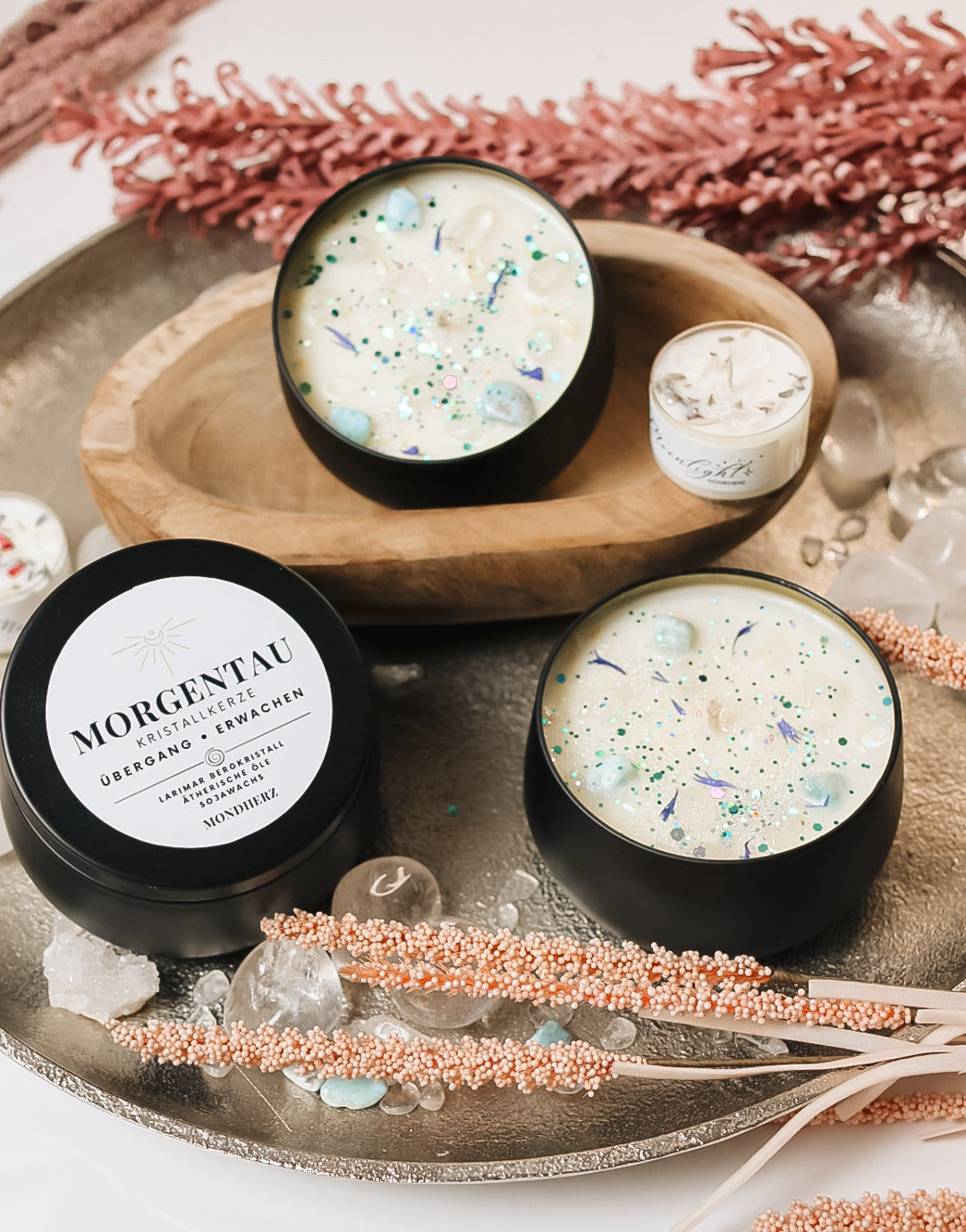 Die spirituelle Kerze Morgentau wurde aus hochwertigem Bio-Sojawachs handgefertigt und mit natürlichen ätherischen Ölen, Duftölen, Kristallen sowie echten Blüten veredelt. Sie wurde achtsam gefertigt und bewusst ausgerichtet, um dich sanft in einen neuen Tag oder einen neuen Abschnitt zu begleiten.