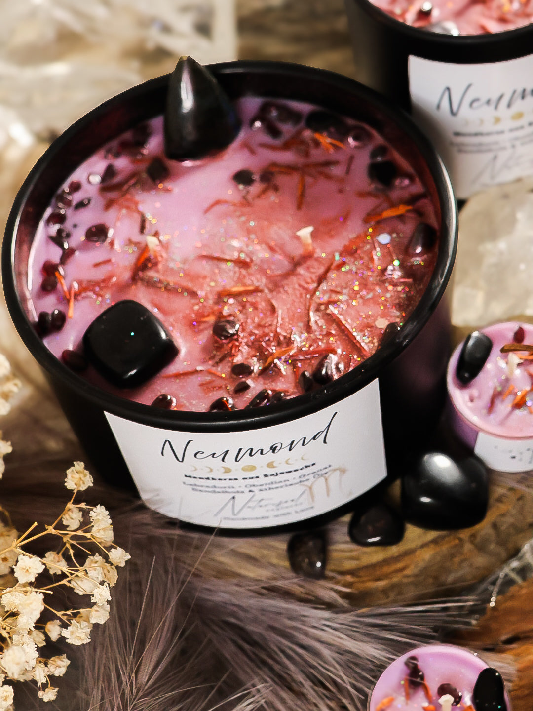 XL Neumond Kristallkerze mit Labradorit, Obsidian, Granat und Sandelholz